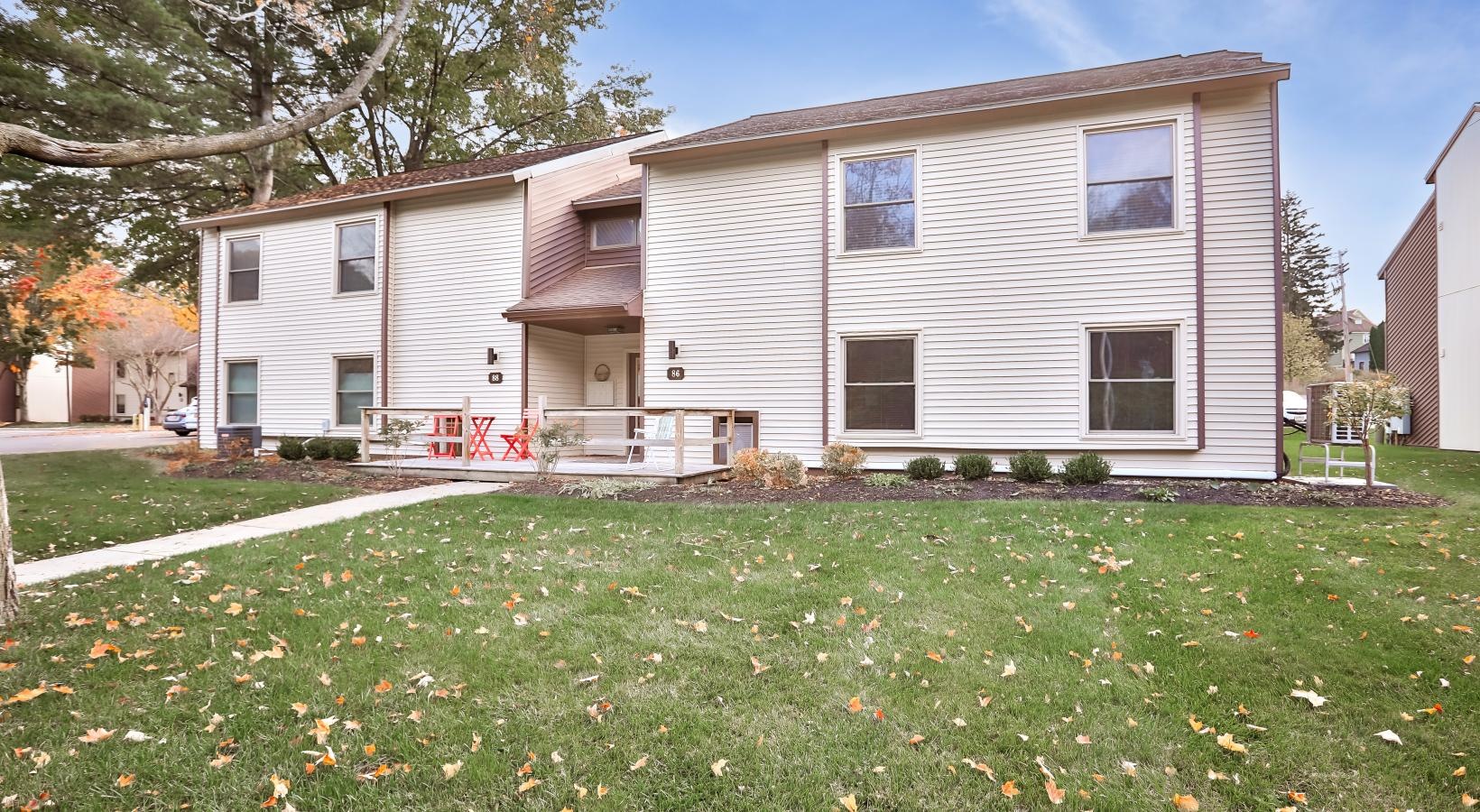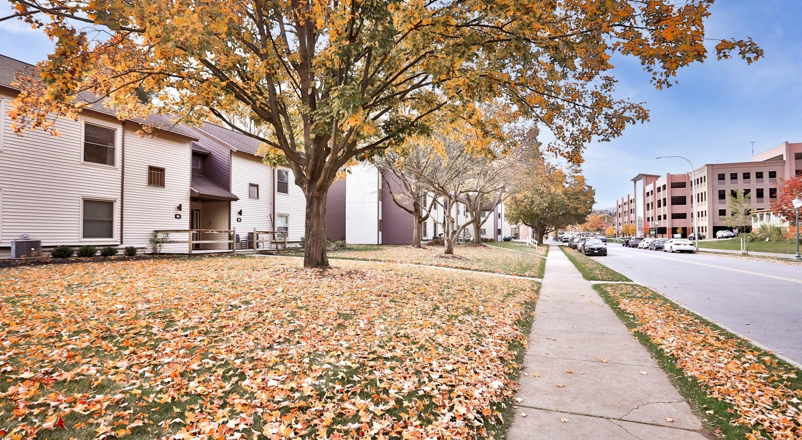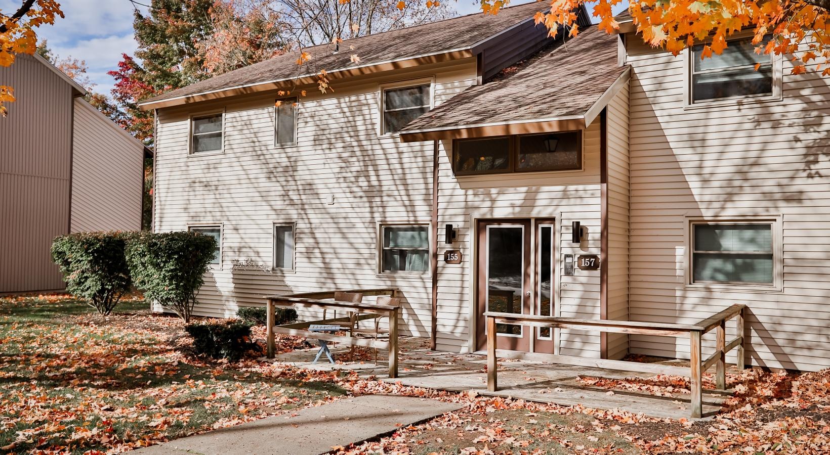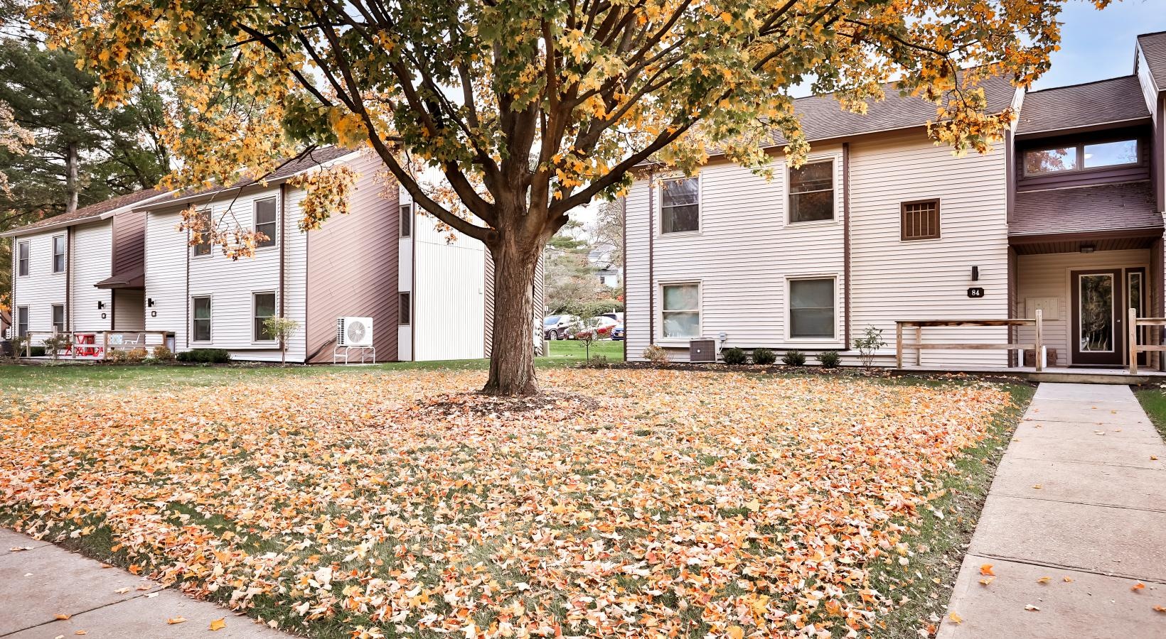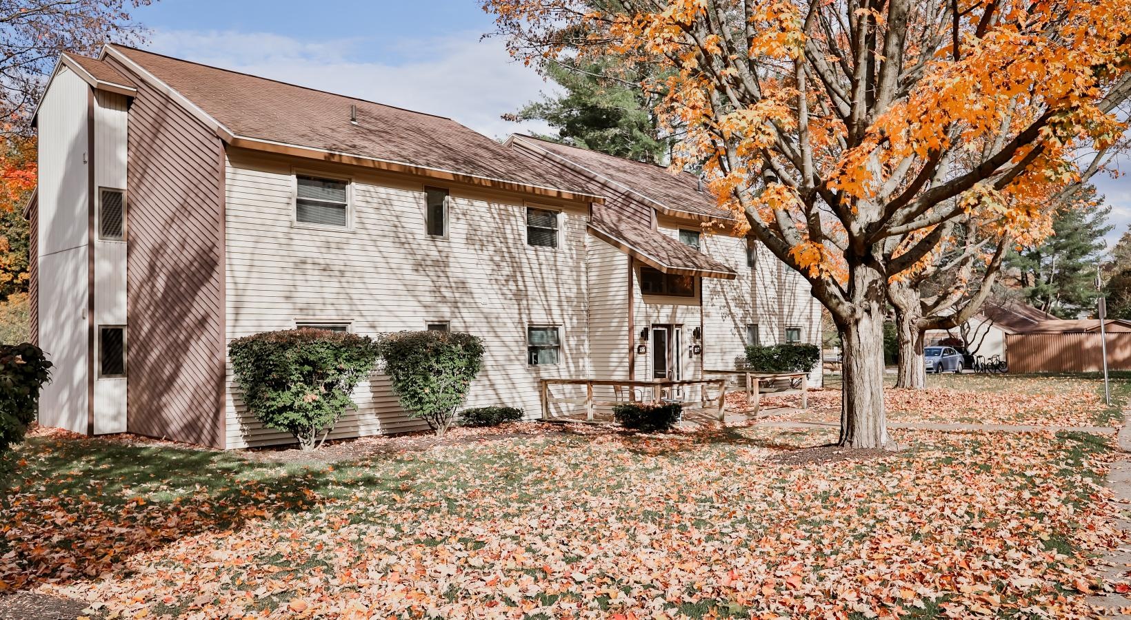• a house with trees around it and fallen leaves
