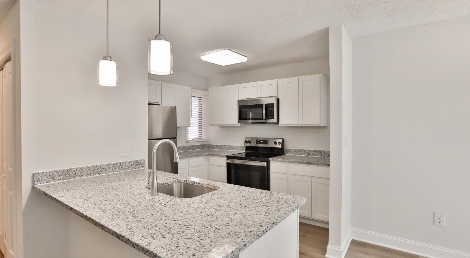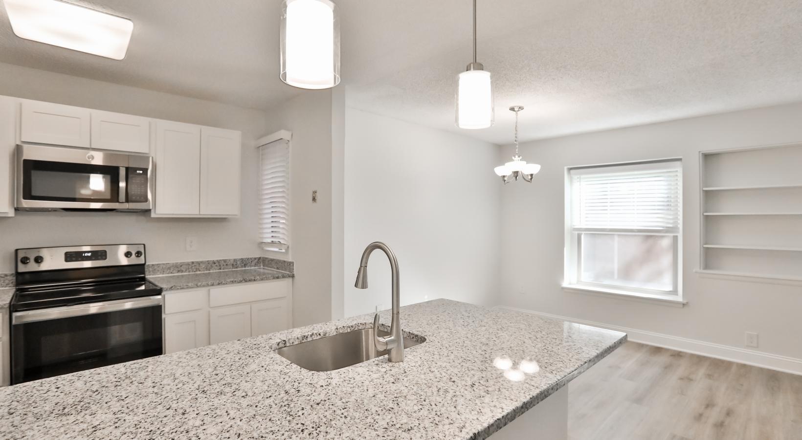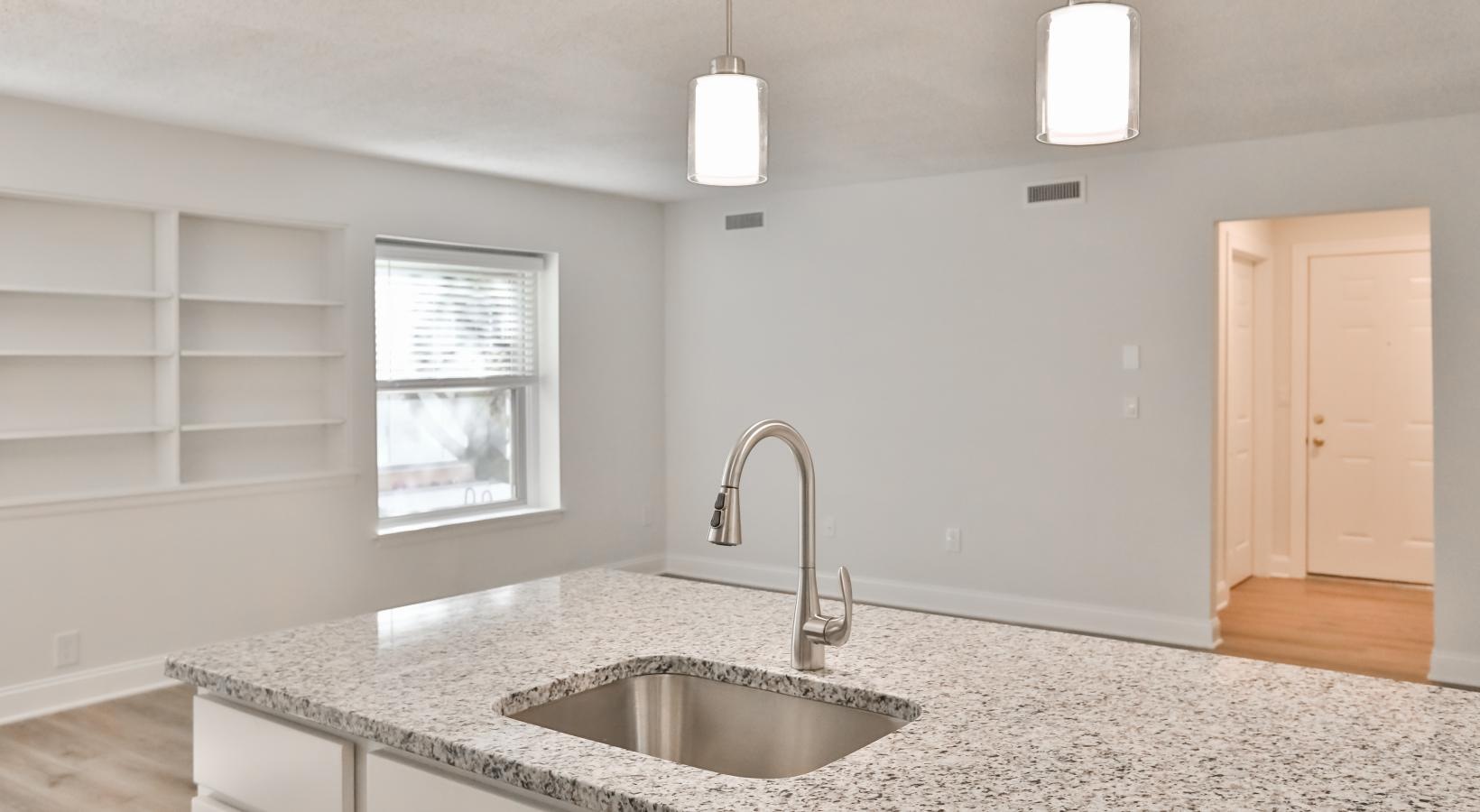 • a kitchen with a marble countertop