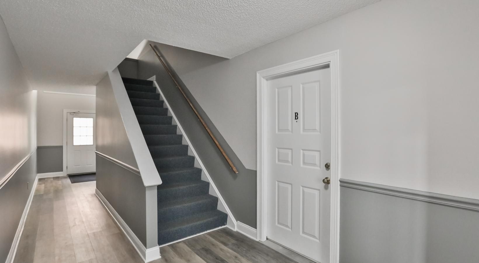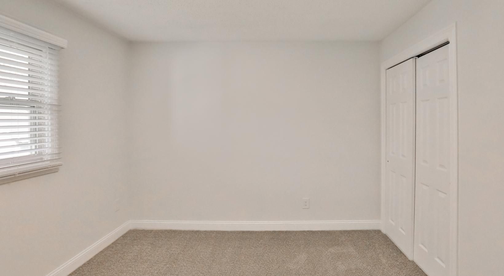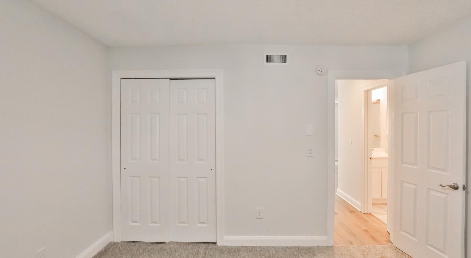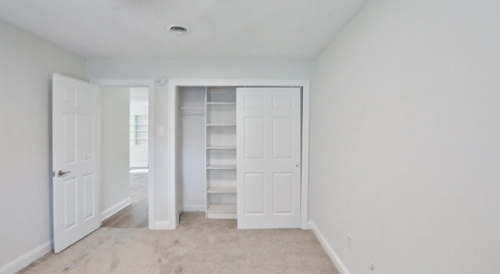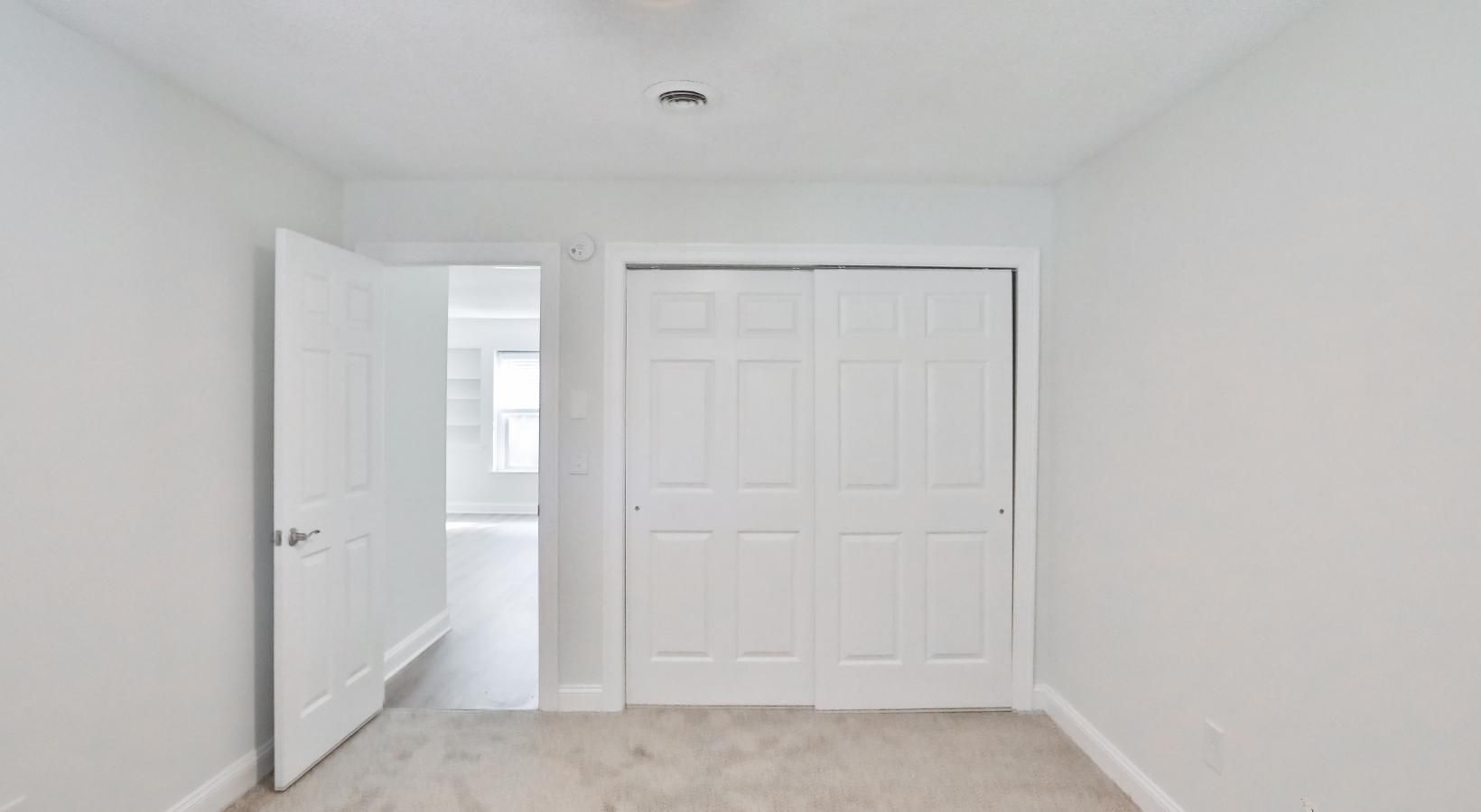 • a bedroom with a white door and carpet