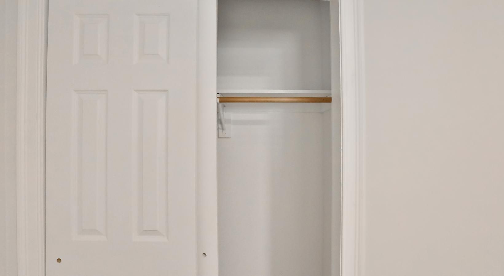 • a bedroom with white walls and a white closet