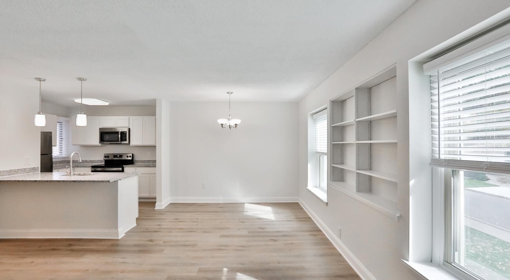 • a kitchen with a window and a large living room