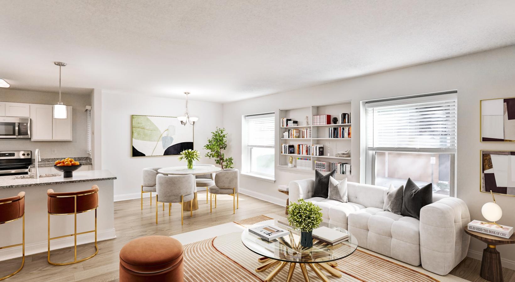 • a living room with a white couch and a table