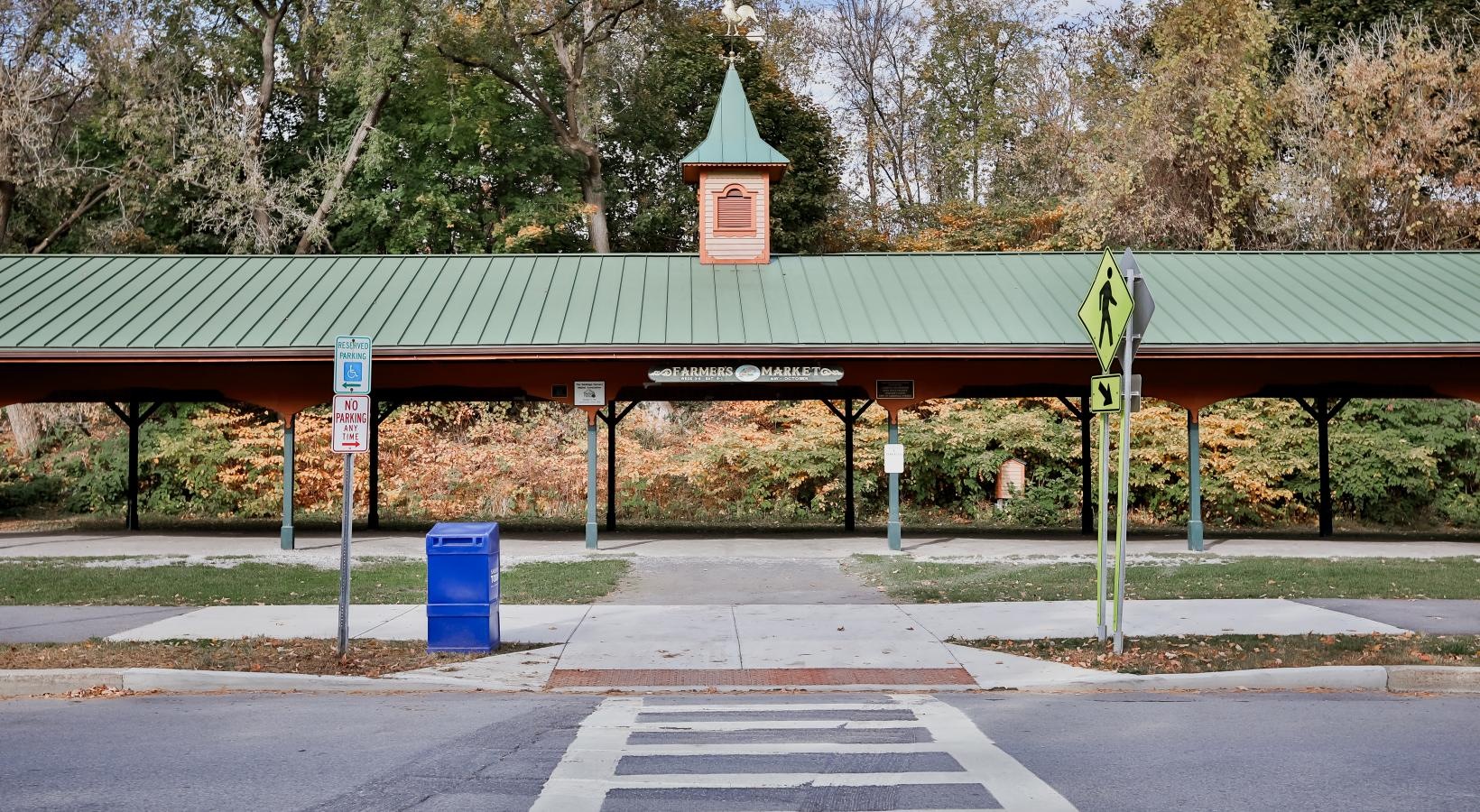 • a sidewalk and trees next to a building
